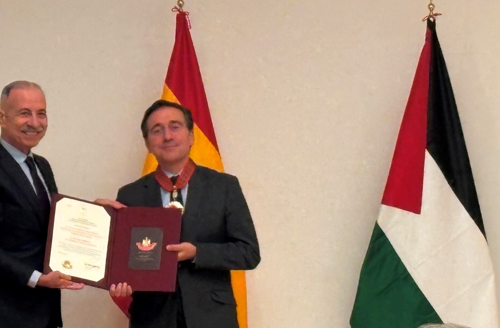 Albares recibió la Estrella al Mérito de la Orden del Estado de Palestina de manos del embajador, Husni Abdelwahed, que fue concedida por el presidente de la ANP, Mahmud Abbás.