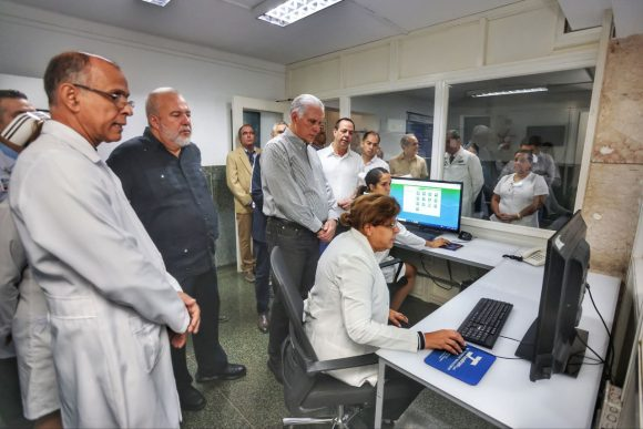 Acompañado por el primer ministro Manuel Marrero Cruz, el viceprimer ministro Eduardo Martínez Díaz y el ministro de Salud Pública José Ángel Portal Miranda, el Presidente recorrió áreas del centro e intercambió sobre las experiencias en la digitalización de las historias clínicas.