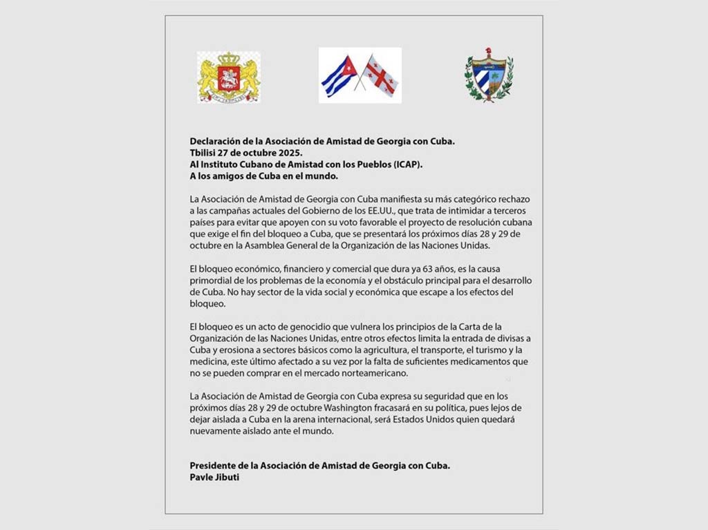 Igualmente, la Asociación de Amistad de Georgia con Cuba manifiesta su más categórico rechazo a las campañas actuales del gobierno estadounidense, que trata de intimidar a terceros países para evitar que apoyen con su voto favorable el proyecto de resolución cubana que exige el fin del bloqueo al país latinoamericano.